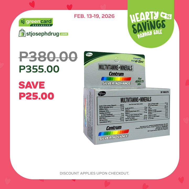 | Centrum Silver Advance is a daily multivitamin specially formulated to protect the health and support the needs of men and women aged 50+ . What does each Centrum Silver Advance tablet contain? Centrum Silver Advance has 25 nutrients and antioxidants to support the following benefits and more! -Has 10 Immunity-boosting vitamins, minerals and antioxidants such as Vitamin A, C, Vitamin D, E Selenium, Zinc and more -Contains Lycopene as well as Folic Acid, Vitamin B6 and B12 to help keep your heart healthy -Contains Thiamine, Pantothenic acid, Biotin, Vitamin B6 and B12 to help your nerves function normally. -WIth Lutein and Beta-Carotene(Vitamin A) for healthy eyes. -With Vitamin B6 and D, Calcium, Copper, Manganese, Magnesium, Zinc to support strong bones and muscles -Contains B vitamins fto help turn your food into energy for the day -Has VItamin C and E to help keep your skin, hair and nails healthy. How do I use this product? Take 1 tablet once daily. Do not exceed recommended daily dose/amount. If taking other supplements; which may also contain Vitamin A; read the label to ensure that you do not exceed the upper tolerable intake levels of 3000 mcg RE (retinol equivalent)/day. Product contains iron which could be harmful to children if taken in large doses. In case of accidental overdose; discontinue use and seek professional assistance immediately. KEEP OUT OF REACH OF CHILDREN. As with any drug; if you are pregnant ot breastfeeding you should seek the advice of a doctor before using this product. Pack Size: 30s tablets (Good for 1 month) If symptoms persist, consult your doctor. |